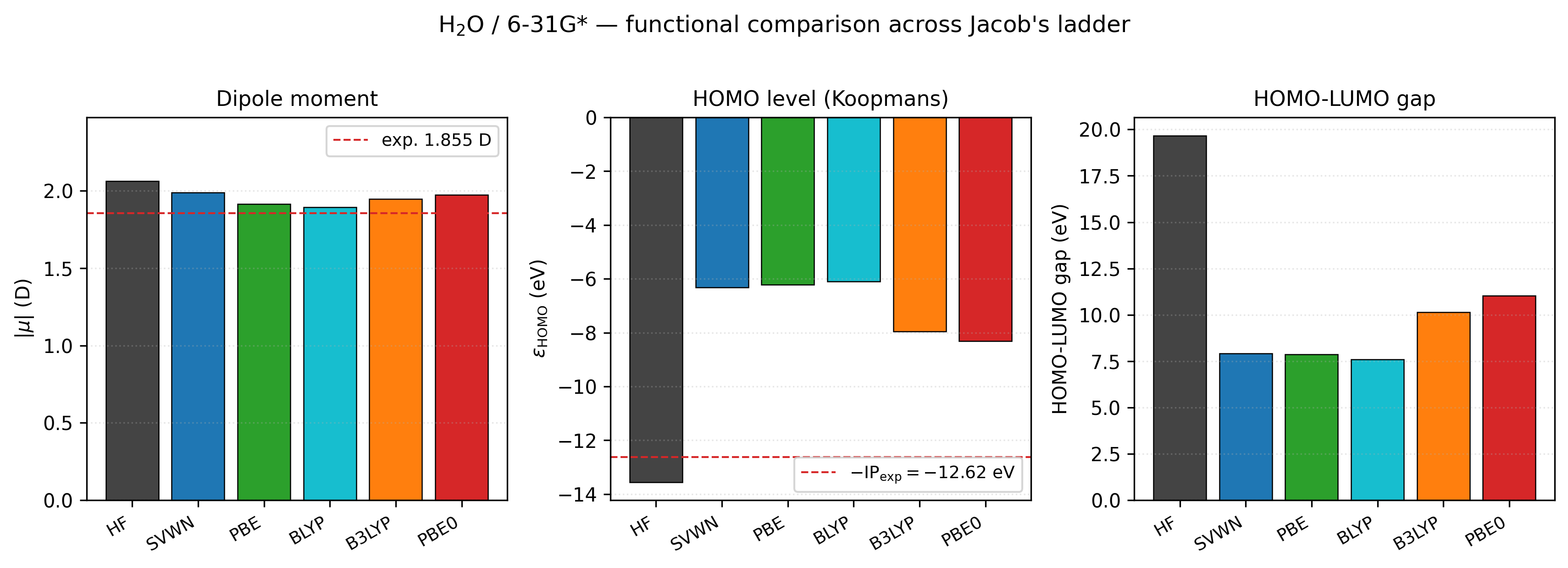 | Method | \(E\) (Ha) | \(|\mu|\) (D) | \(\varepsilon_{HOMO}\) (eV) | \(\varepsilon_{LUMO}\) (eV) | gap (eV) | |—|—:|—:|—:|—:|—:| | HF | −76.00668 | 2.061 | −13.56 | +6.11 | 19.67 | | LDA (SVWN) | −75.83424 | 1.988 | −6.32 | +1.61 | 7.93 | | GGA (PBE) | −76.31284 | 1.914 | −6.23 | +1.65 | 7.88 | | GGA (BLYP) | −76.37826 | 1.892 | −6.11 | +1.50 | 7.60 | | hybrid (B3LYP) | −76.40105 | 1.946 | −7.95 | +2.19 | 10.14 | | hybrid (PBE0) | −76.31857 | 1.971 | −8.32 | +2.70 | 11.02 |
